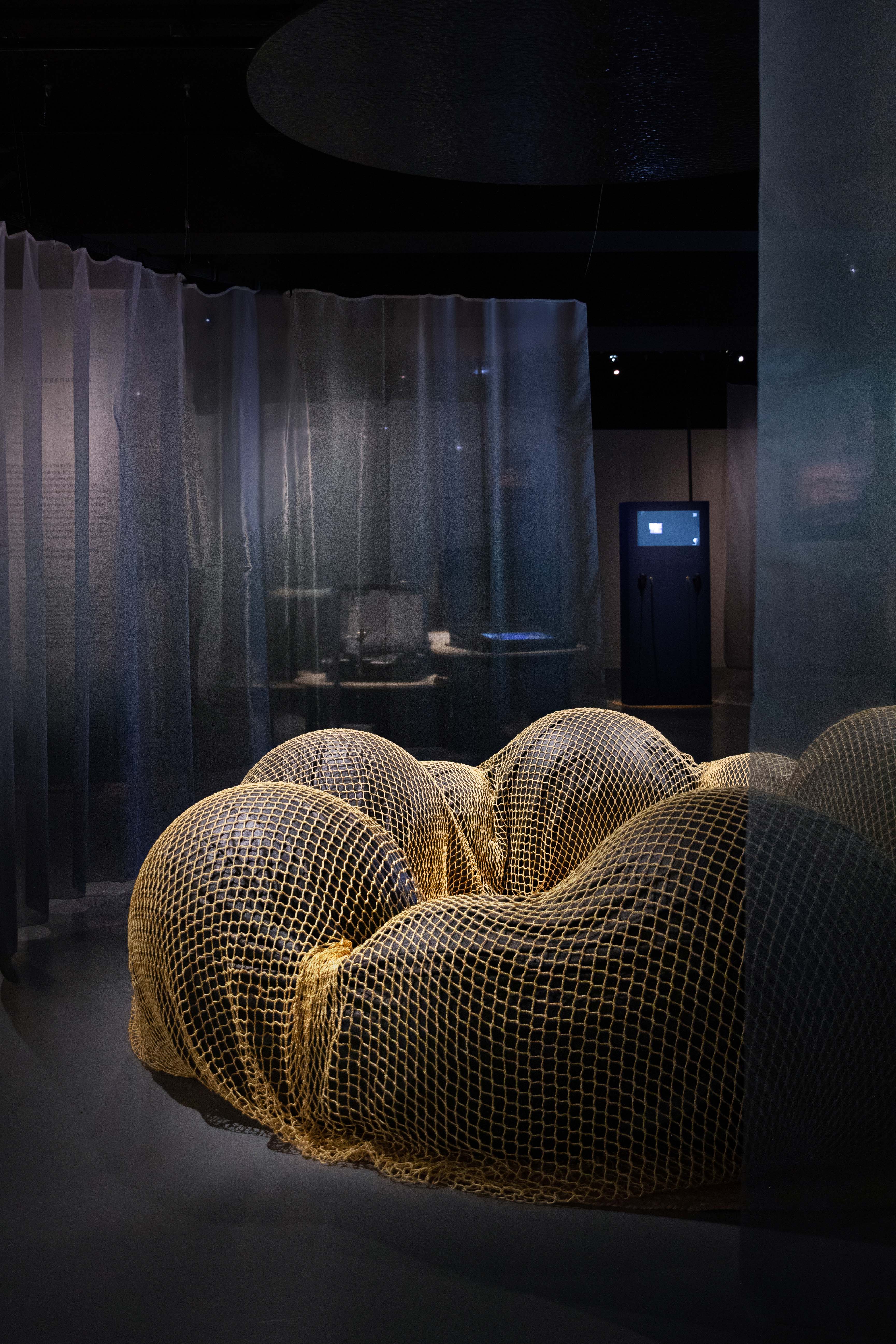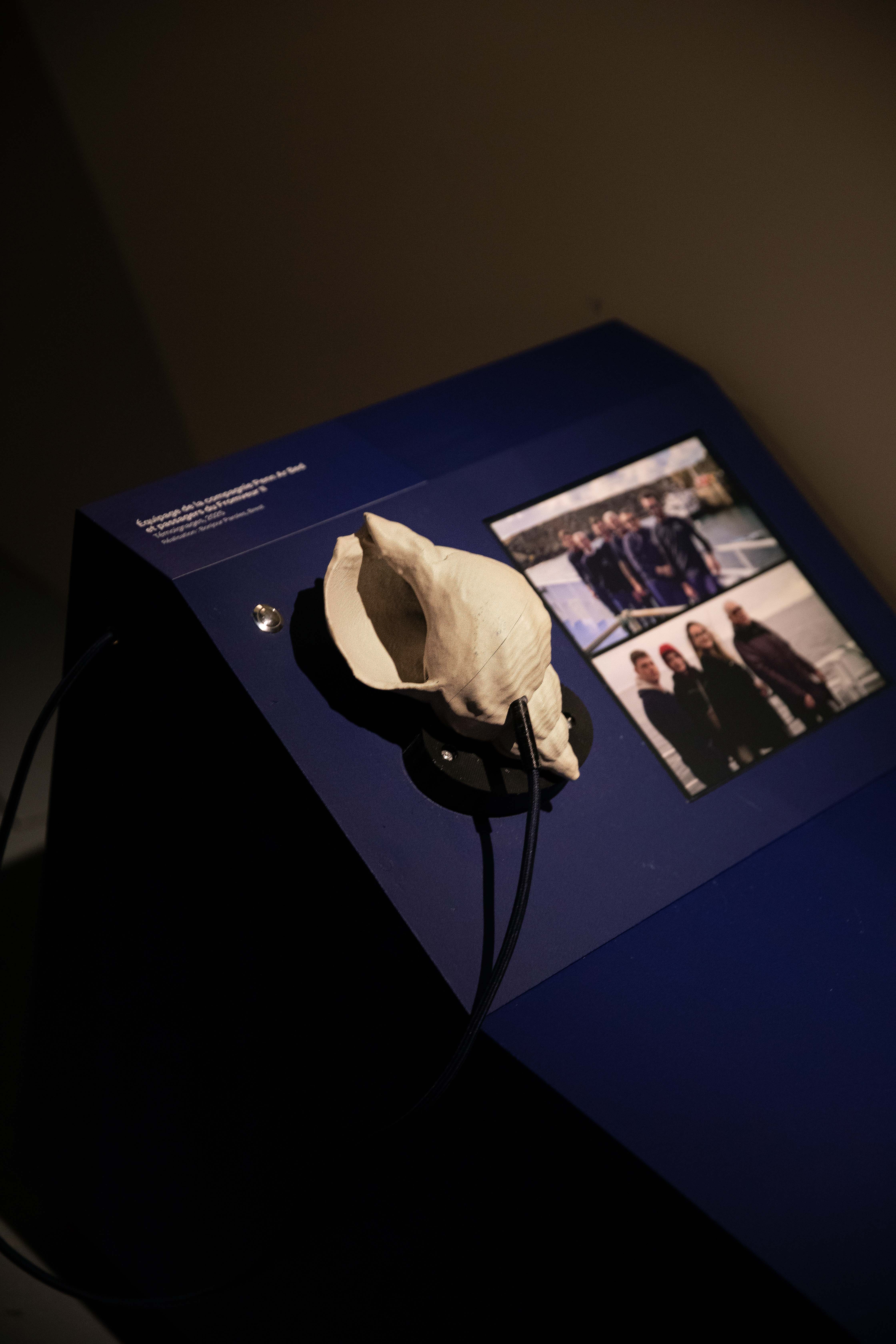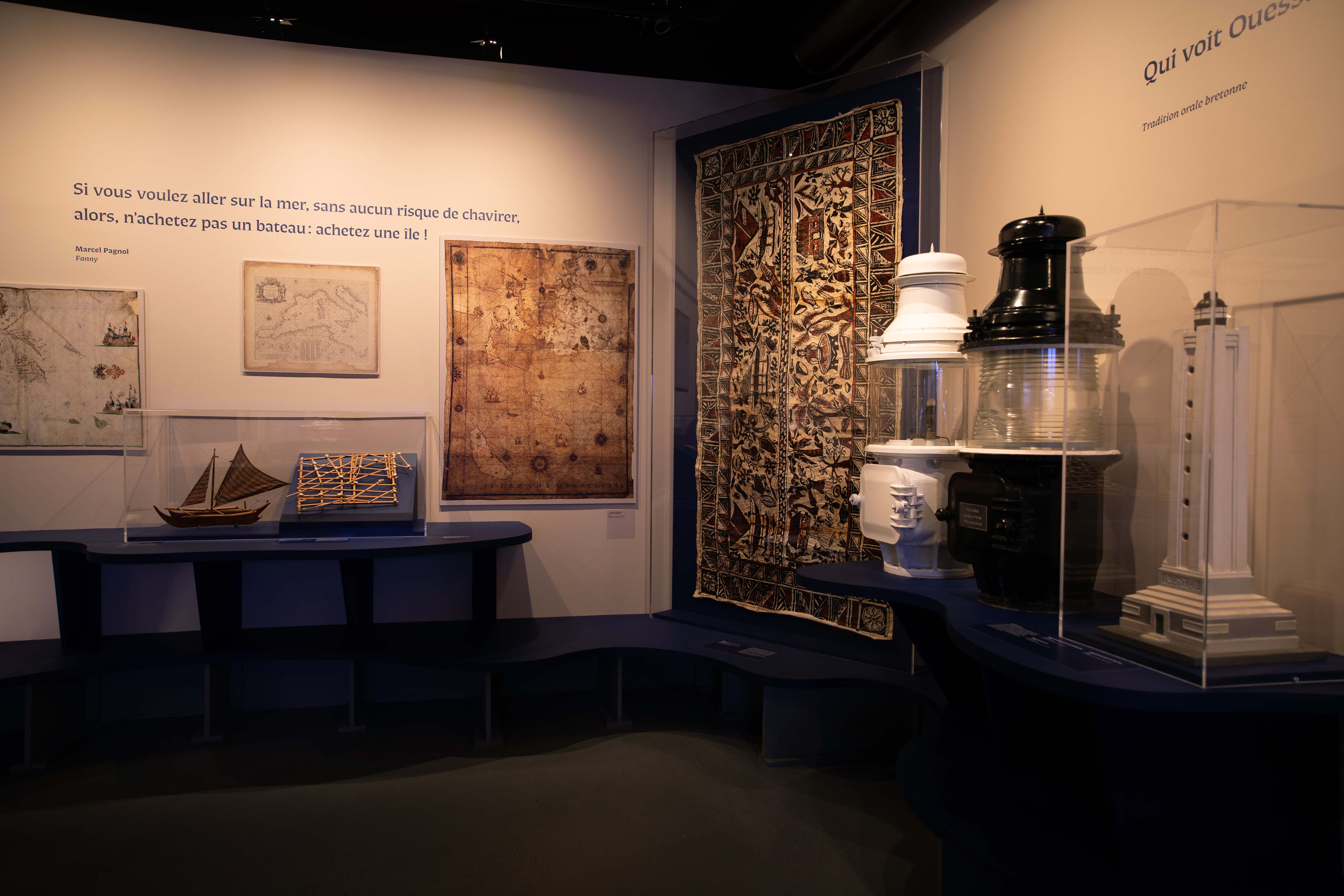 Des dispositifs sensoriels, sons, odeurs, projections, vitrines et mouvements, renforcent l’immersion et invitent le visiteur à une déambulation libre et participative, entre bleu profond et tons ocre des rivages.