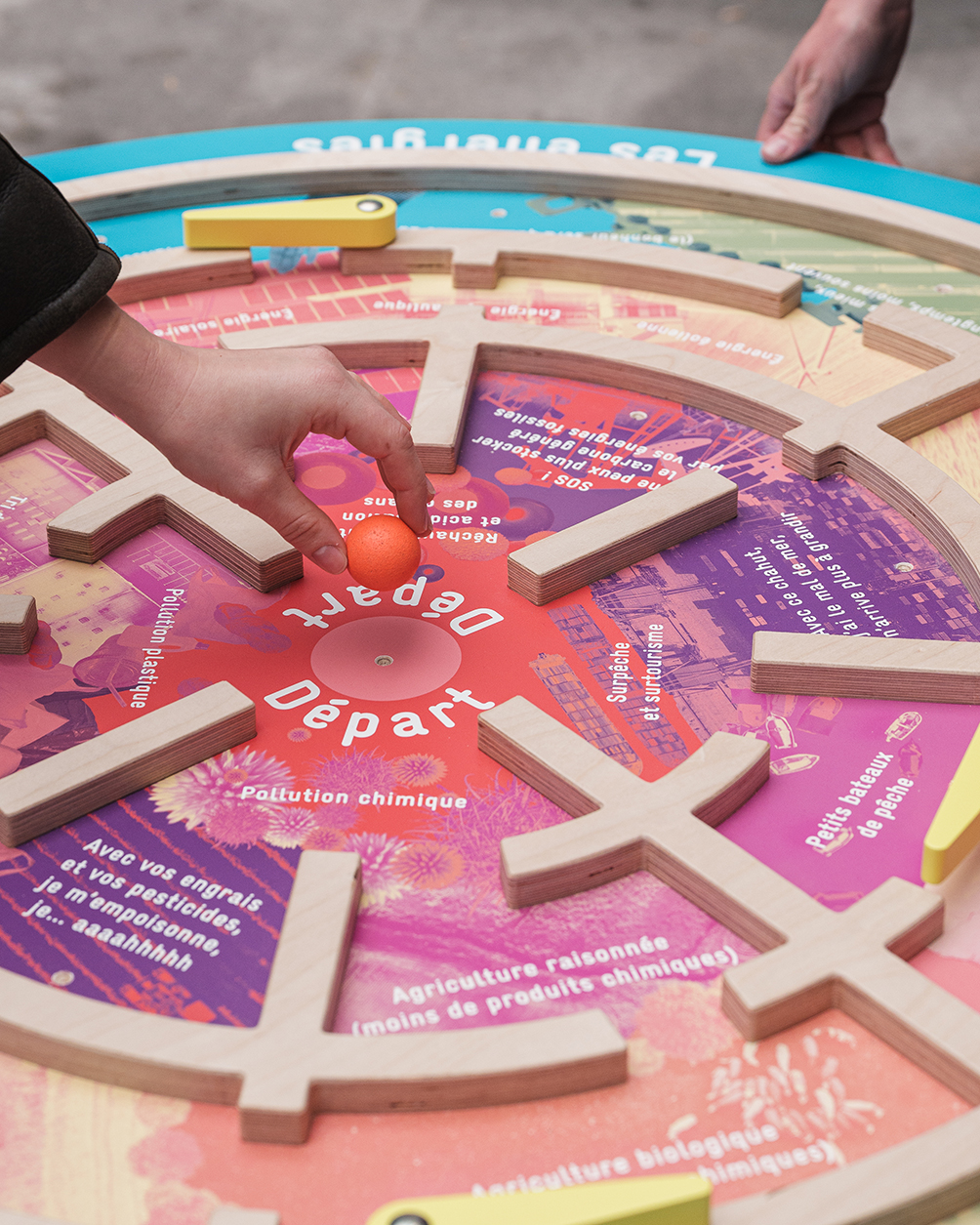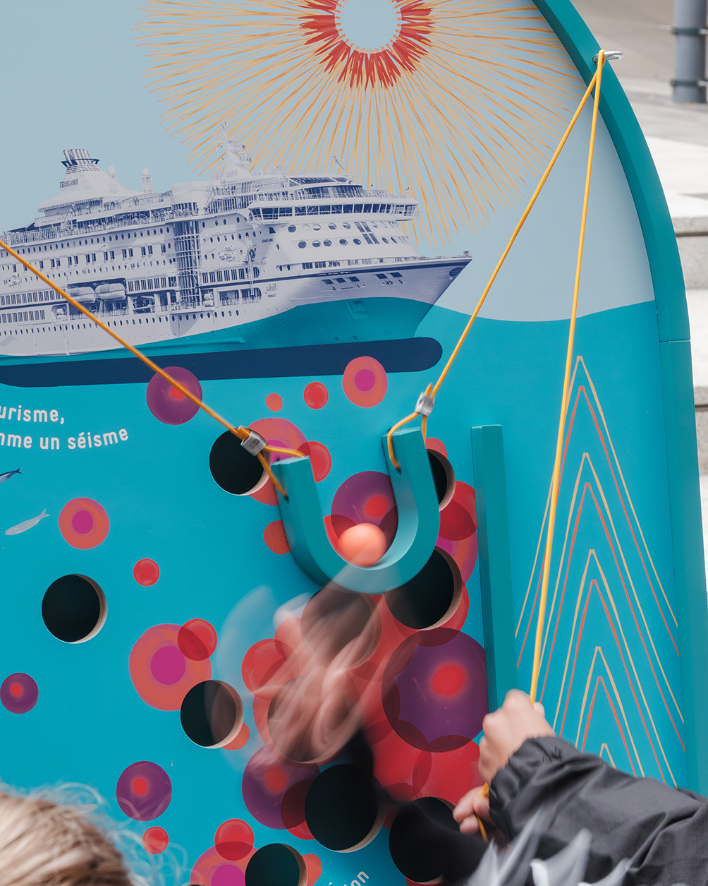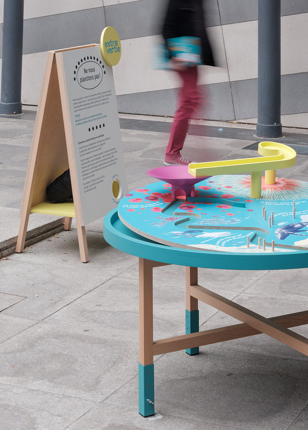 L’installation Extravertie propose une expérience immersive pour s’interroger sur l’urgence environnementale de manière ludique. Choisissant le prisme de l’art et de l’humour, et prenant place au sein de l’espace public, l’installation détourne les codes populaires de la kermesse. Il s’agit de mettre notre corps en action, déconstruire nos certitudes et faire émerger d’autres possibles.