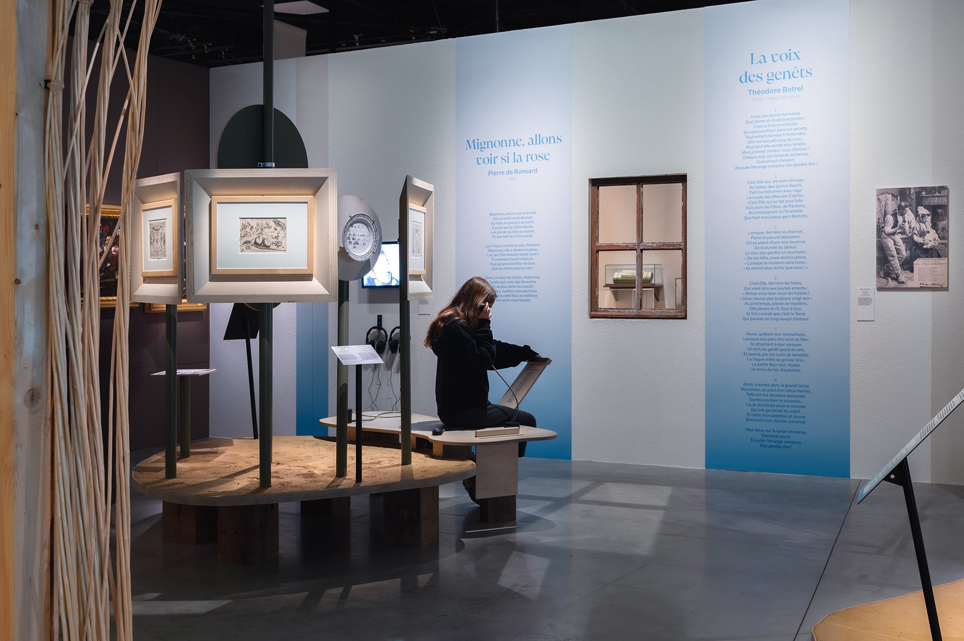 L’écoconception a été au cœur de nos réflexions pour ce projet. Nous avons privilégié des éléments naturels pour les décors scénographiques, la conservation d’un maximum de cimaises existantes, des nouvelles constructions en bois de réemploi d’anciennes expositions, le chinage de mobiliers anciens et la réutilisation des mobiliers stockés de l’écomusée.